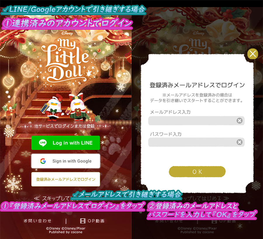【DISNEY MY LITTLE DOLL // マイリトルドール】におけるアカウントの引き継ぎ準備/設定方法について解説します。